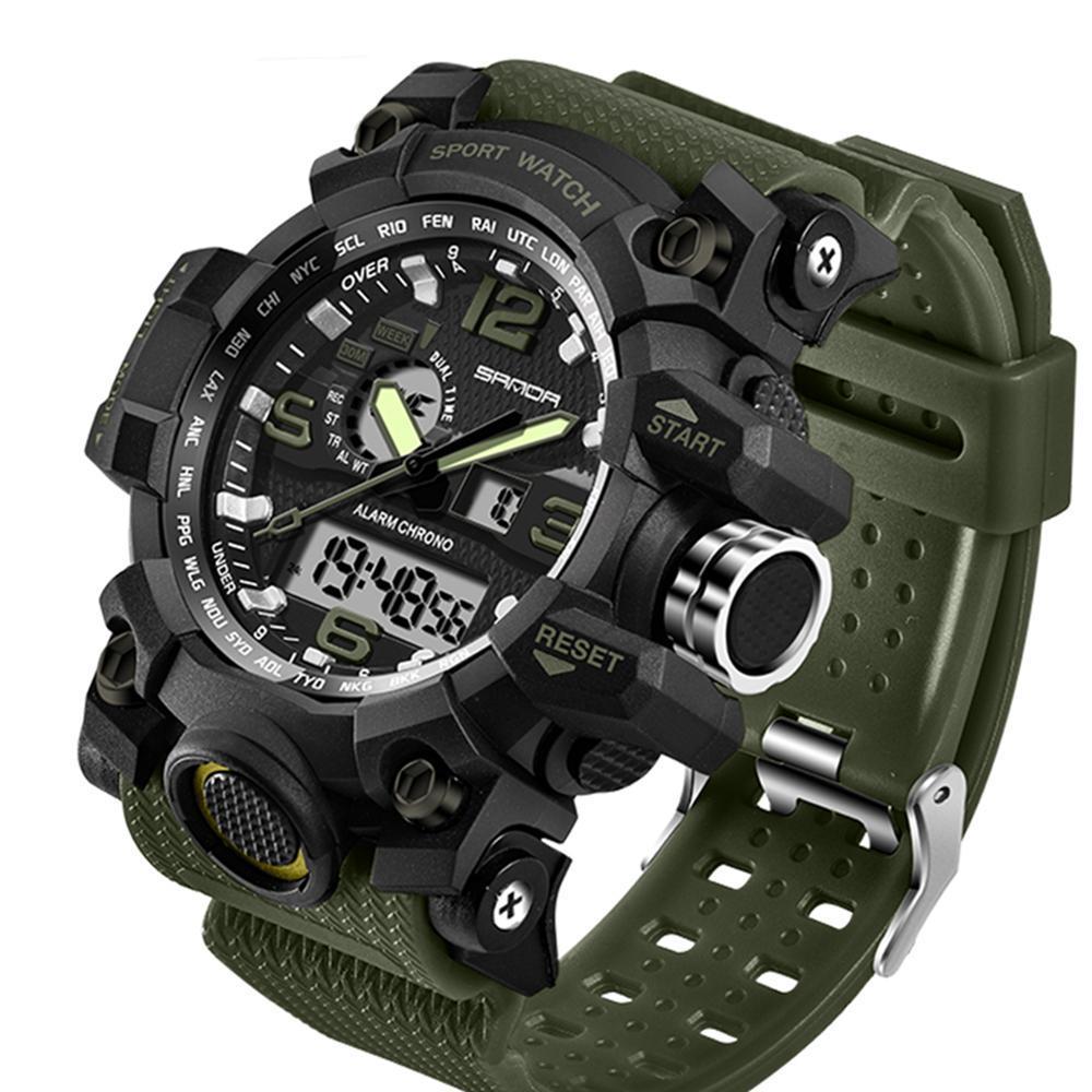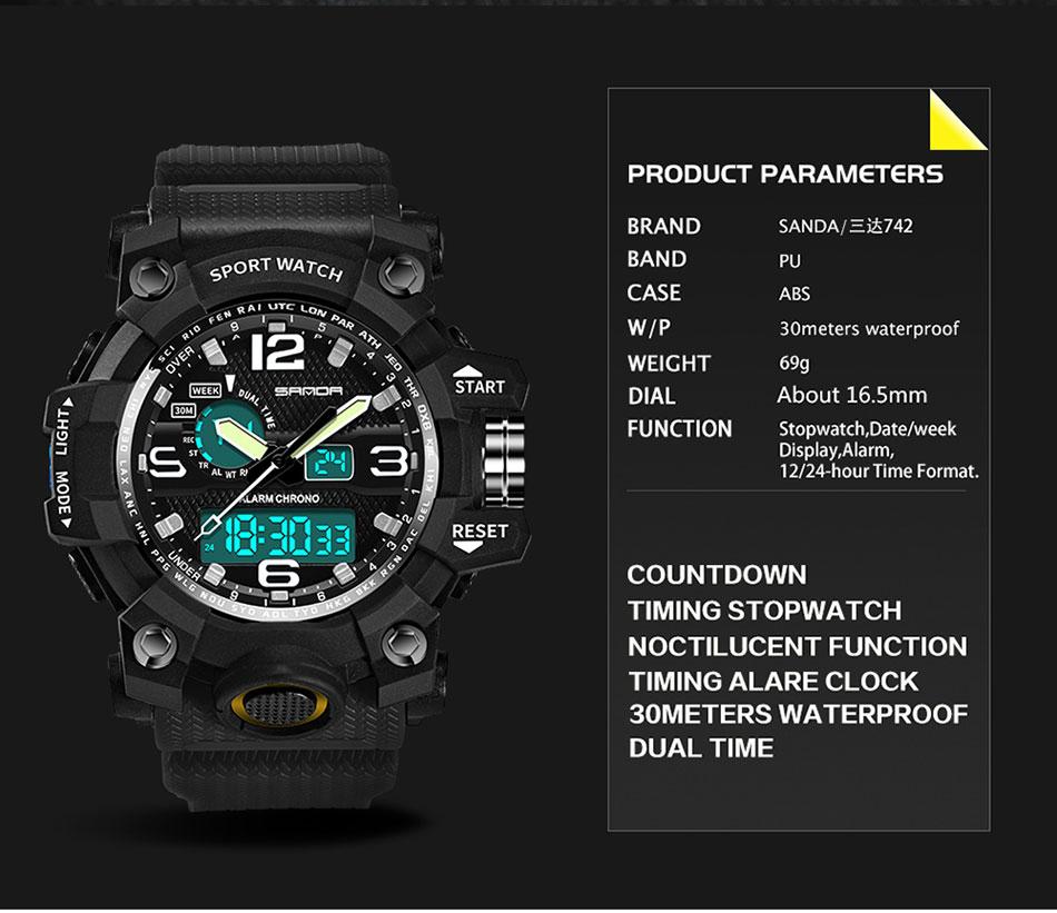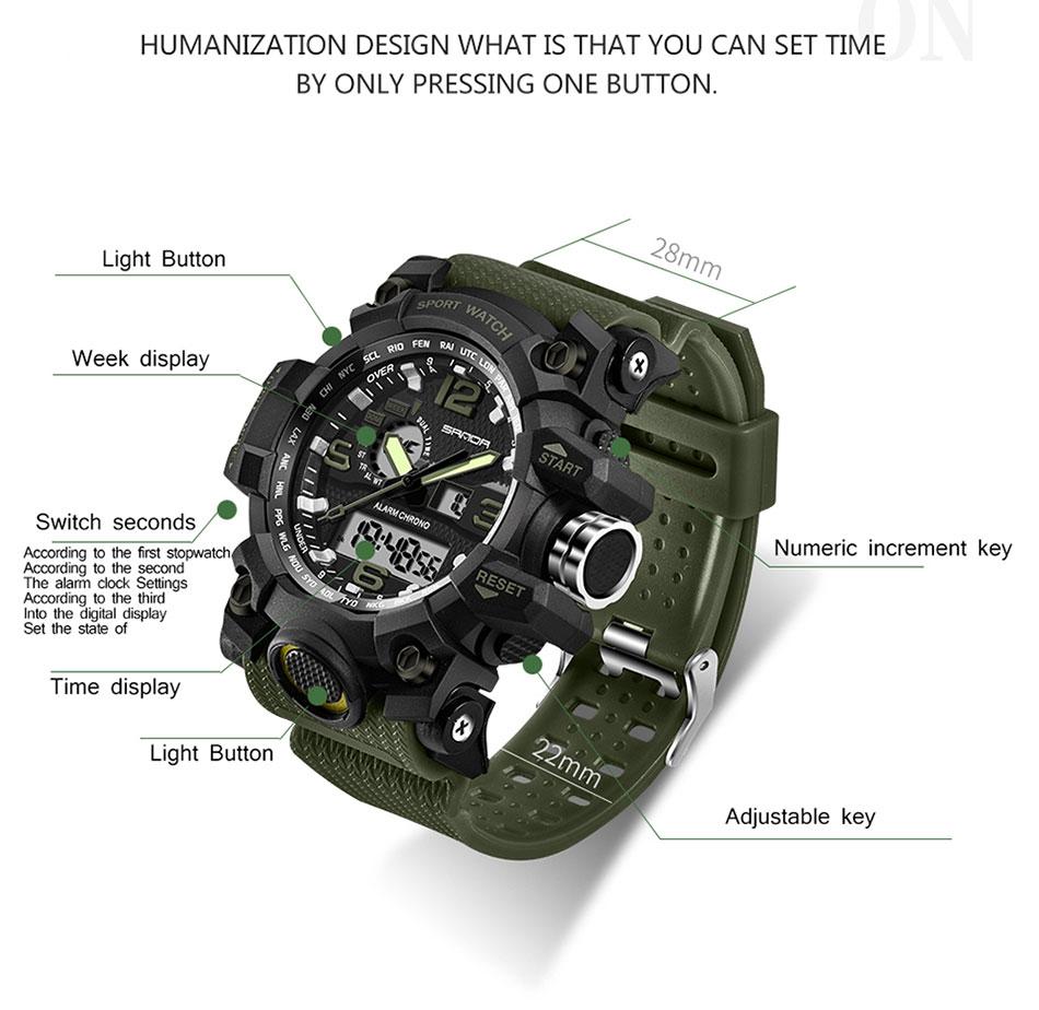- Feature: Back Light,Alarm,Water Resistant,Luminous,Multiple Time Zone,Chronograph,Shock Resistant,Stop Watch,Complete Calendar,Auto Date,LED display